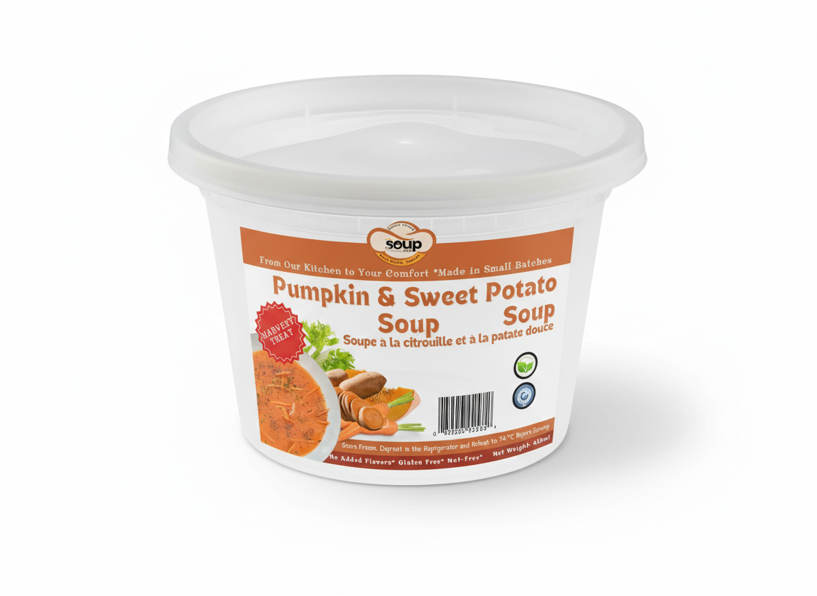 Our Pumpkin and Sweet Potato Soup combines the earthy richness of pumpkin with the natural sweetness of sweet potatoes, blended into a velvety smooth texture. Balanced with subtle spices and fresh herbs, this soup is both nourishing and indulgent—perfect for a comforting meal on any day.